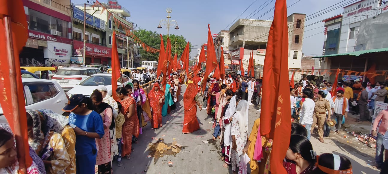 यात्रा का आगाज सुबह भिखारीपुर तिराहे पर भव्य आरती के साथ हुआ। 11 ब्राह्मणों के मंत्रोच्चार और 200 से अधिक डमरूओं की थाप ने वातावरण में अद्भुत ऊर्जा भर दी। आकर्षण का मुख्य केंद्र 60 फीट लंबा वाहन था, जिस पर प्रभु श्री राम का दरबार और हनुमान जी की पालकी विराजमान थी।