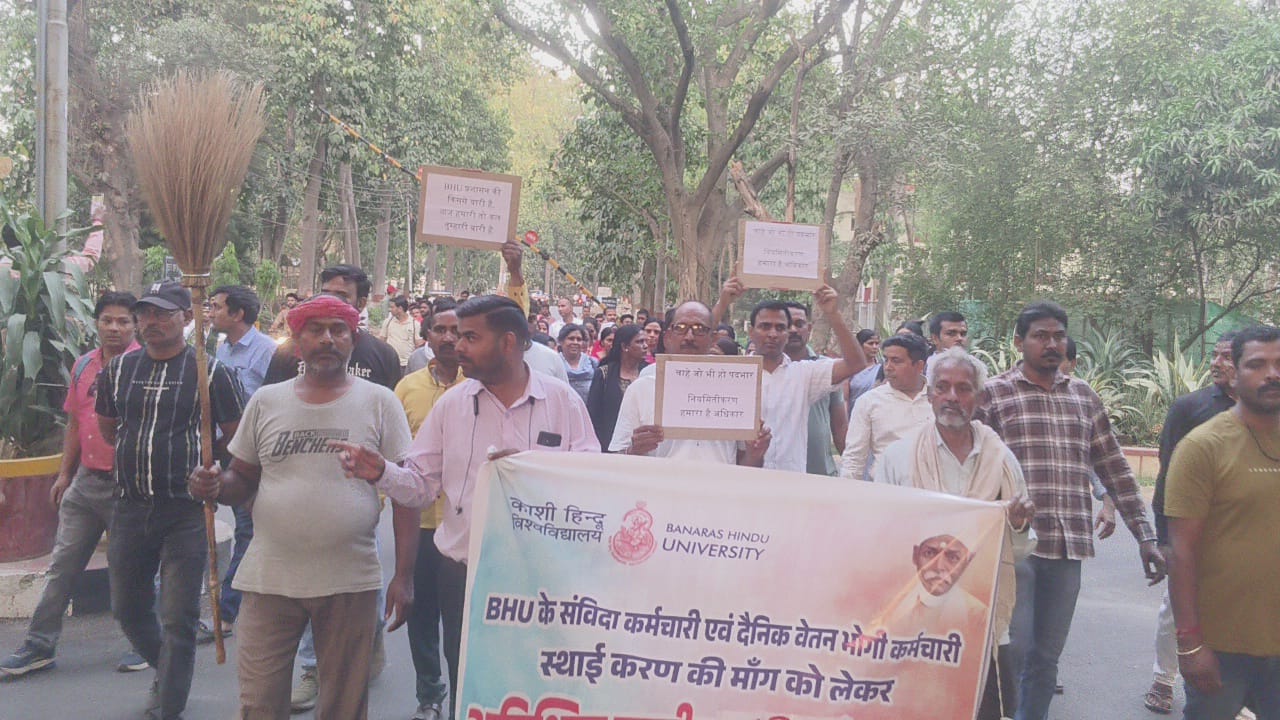 वाराणसी। काशी हिंदू विश्वविद्यालय (बीएचयू) में संविदा कर्मचारी पिछले पांच दिनों से अपनी विभिन्न मांगों को लेकर विश्वविद्यालय परिसर स्थित मधुबन पार्क में शांतिपूर्ण प्रदर्शन कर रहे हैं। बड़ी संख्या में कर्मचारी धरनास्थल पर एकत्र होकर लोकतांत्रिक तरीके से अपना विरोध दर्ज करा रहे हैं।