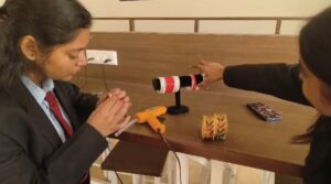 छात्रा ने बताया चूड़ी को बनाने में हमने ब्लूटूथ नैनो मॉड्यूल, ब्लू रेड लाइट, एसडी कार्ड रिडर, बैटरी, माइक्रोफोन, इत्यादि का इस्तेमाल कर तैयार किया है ।