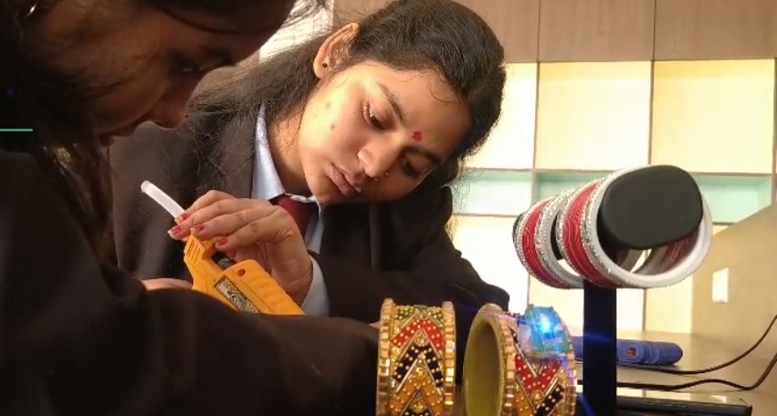 छात्रा ने बताया चूड़ी को बनाने में हमने ब्लूटूथ नैनो मॉड्यूल, ब्लू रेड लाइट, एसडी कार्ड रिडर, बैटरी, माइक्रोफोन, इत्यादि का इस्तेमाल कर तैयार किया है ।